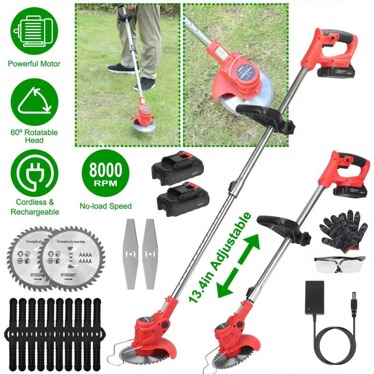 Cordless & Rechargeable: Provides 2 packs 1500mAh rechargeable batteries and 1 adapter for portable charging. After fully charged, our grass trimmer is convenient to use with no more cumbersome wiring, no more messy. It is unlimited restraint, free movement, flexible, easy to use.