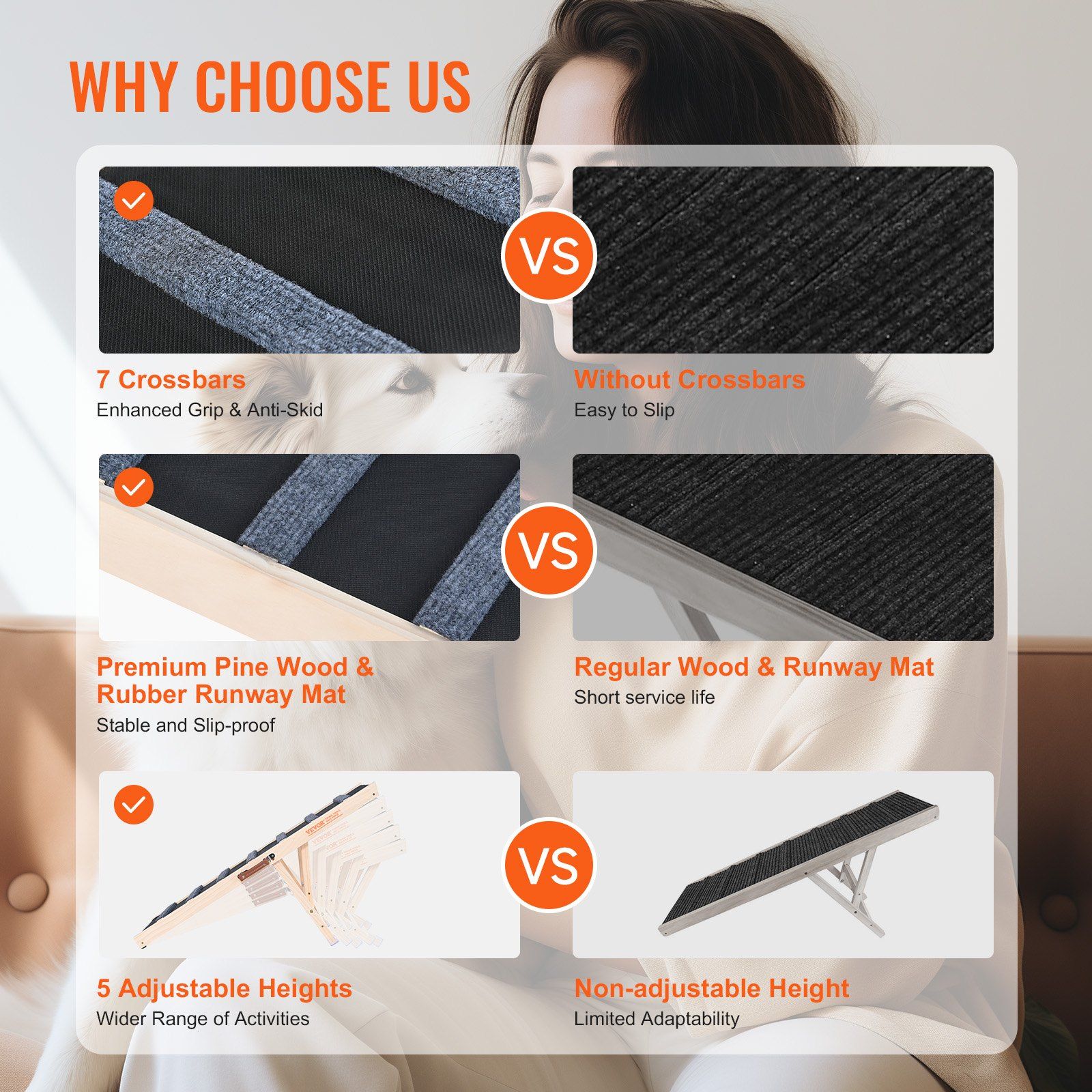1.High Traction & Non-Slip Surface: The dog ramp features a high-traction rubber carpet with grooves, providing your pet with a secure and non-slip surface. The ramp's design includes 7 crossbars that offer added grip to prevent slipping and falling during climbs.
