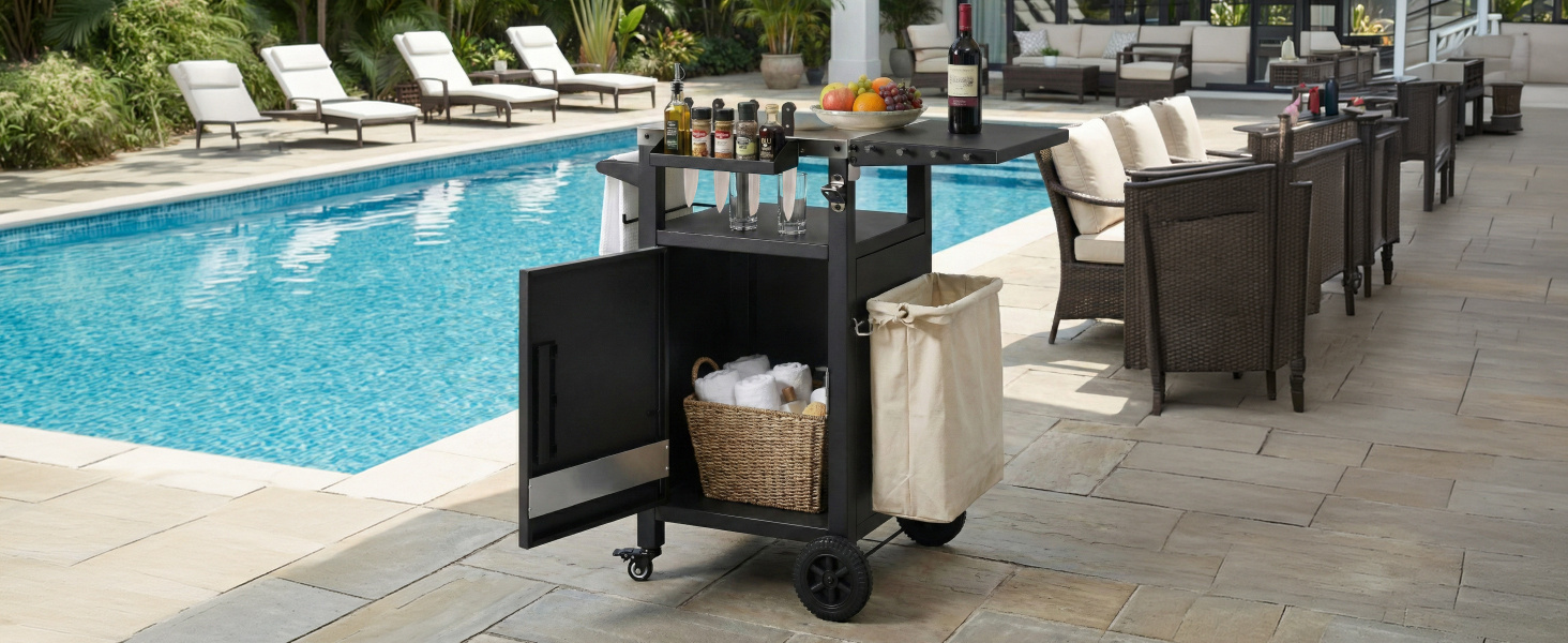 | Summary | This 33.9-inch outdoor steel kitchen prep station meets all your outdoor cooking needs. The spacious 17.7" x 17.7" stainless steel countertop provides ample space for grilling and food prep, while the side drop leaf offers additional areas for cutting and portioning ingredients. Built-in knife racks and utensil hooks keep cooking tools organized and within easy reach. The front spice rack neatly organizes sauces and seasonings for easy access. A large enclosed storage cabinet provides ample space to store propane tanks and cooking accessories, keeping everything tidy and organized. The side-mounted paper towel holder and trash bin keep your workspace clean and clutter-free. Equipped with durable casters, the grill cart glides smoothly to any desired location, making it ideal for outdoor parties and events. The cart includes a 420D Oxford fabric waterproof cover that shields against rain while blocking dust and UV rays on sunny days. |