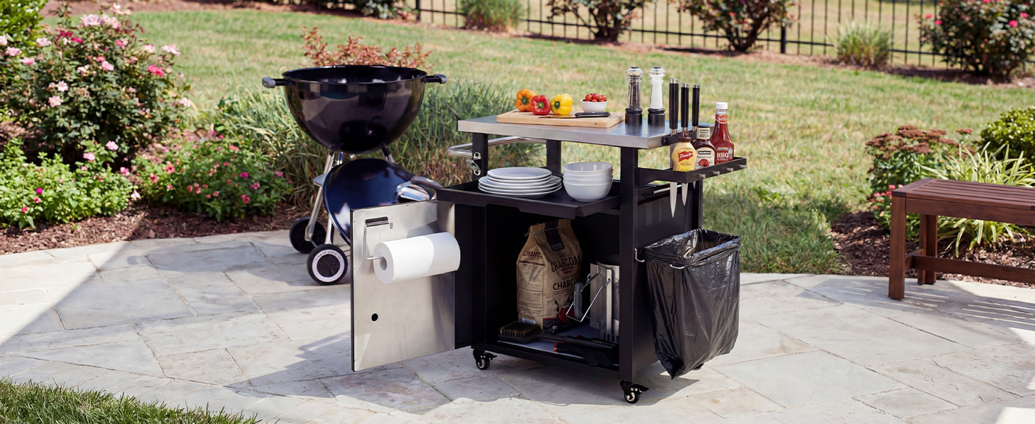 | Summary | The 39.5 in Outdoor Kitchen Prep Station provides everything you need for outdoor cooking. A 20in x 30in stainless steel table provides a large space for food prep, and a slide-out drawer provides additional space for your cooking tools, dishware, and other materials. A side condiment tray and tools rack can help you keep all the seasonings, sauces, and grill tools. The single double-walled door with a paper tissue holder has the insulation material to provide a heavy-duty feeling; the large cabinet provides a lot of room for storage; and the specific propane hole helps you keep your propane tank safe. This prep and storage station is the perfect item for your patio or deck. Four high-quality caster lockable wheels let you move the station everywhere you want. Enjoy your cooking and be happy with your family at this grill cart! This grill cart comes with a waterproof cover, made of 420D Oxford fabric, which has the function of waterproof in rain, dustproof, and anti-UV on sunny |
