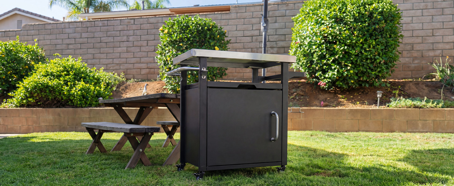 [Heavy Duty Structure] Our outdoor grill cart is designed for stability and convenience! supported by a heavy-metal frame and heavy-gauge square tube legs and enhanced with a 1.6' thick stainless steel countertop, ensuring durability and longevity. It is not only safe but also easy to clean, making post-cookout maintenance a breeze. Each of our metal finishes has been treated to be waterproof.