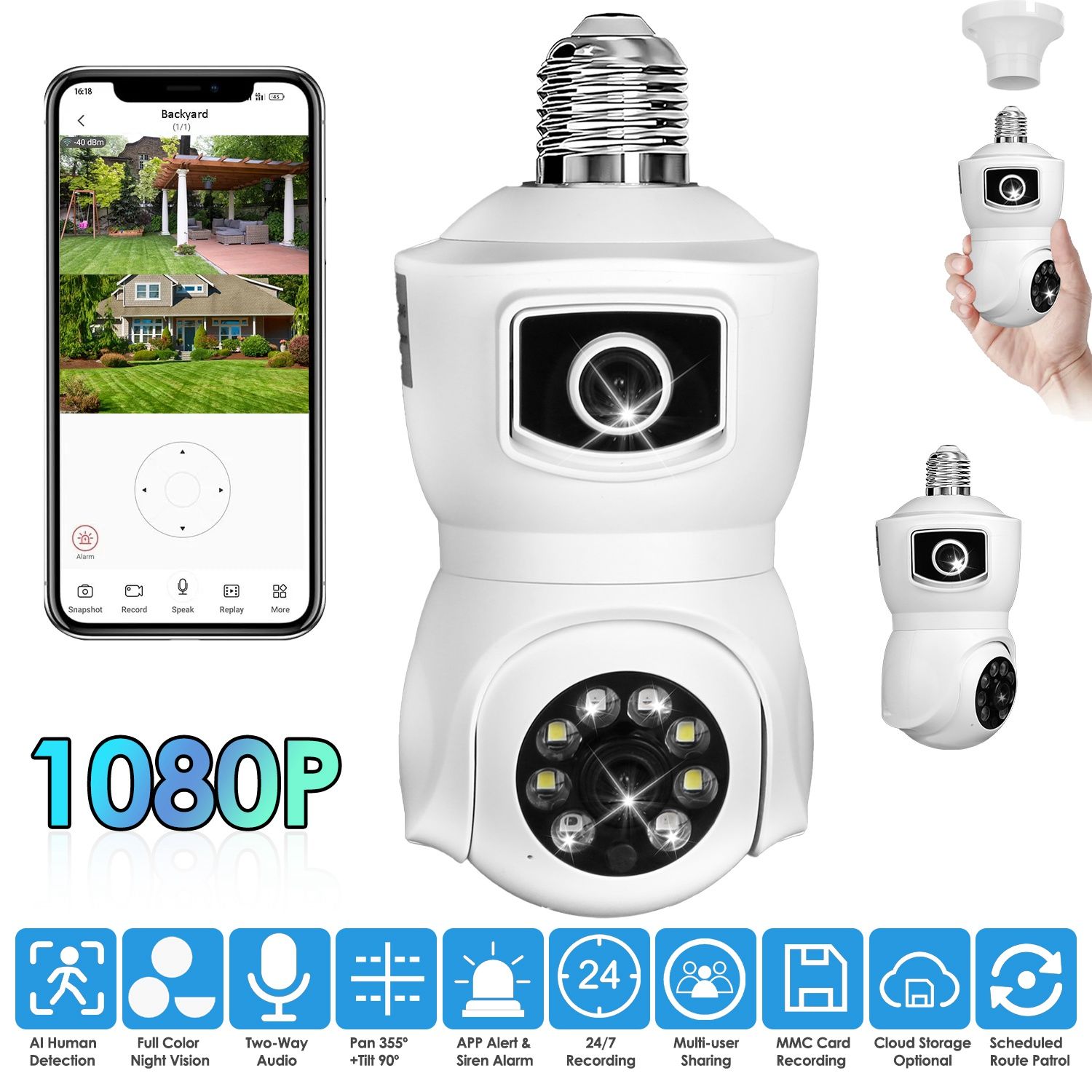 Two-way Audio & 1080P Dual Lens: Built in responsive high-sensitivity microphone and speaker, the E27 WiFi bulb camera enables you clearly talk with your family or visitors on phone. The dual lens captures every scene in 1080P with 200 million pixels, clearly recording every moment.